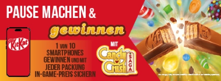Nimm am KitKat® Gewinnspiel teil: Kaufe ein KitKat®, lade deinen Kassenbon hoch und gewinne eines von 10 Smartphones. Erhalte zudem 60 Minuten unendliche Leben bei Candy Crush®