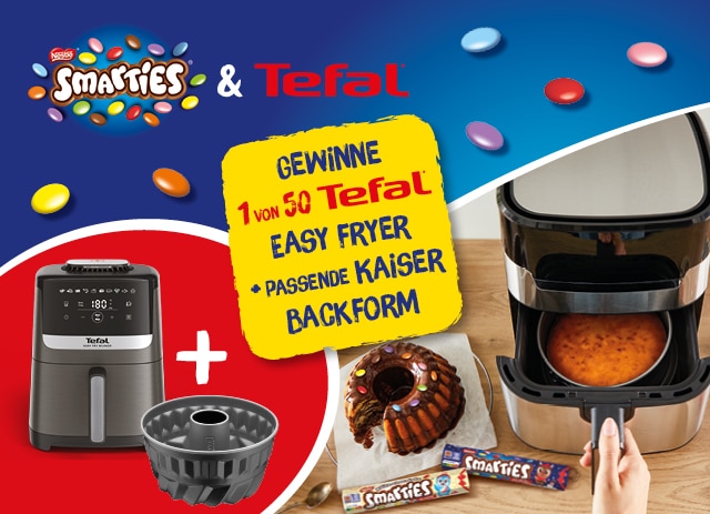 Jetzt Smarties Aktionsprodukt* kaufen und am Gewinnspiel teilnehmen – schon hast du die Chance auf 1 von 50 Tefal Easy Fryern + passender Kaiser Backform** im Wert von 320 Euro. Schnell, einfach, lecker und voller Backspaß für die ganze Familie!
